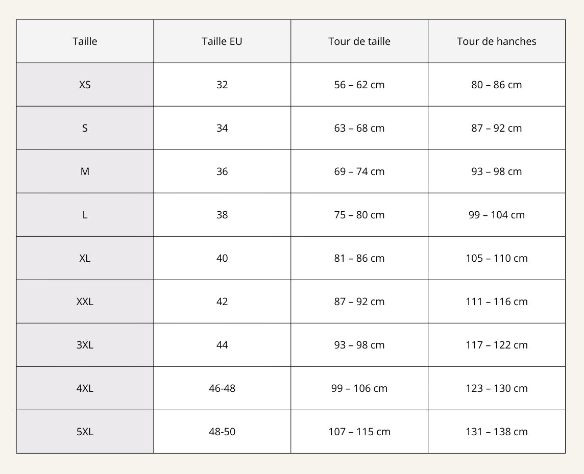 Utilisez le tableau ci-dessous pour trouver la taille qui correspond le mieux à vos mensurations.